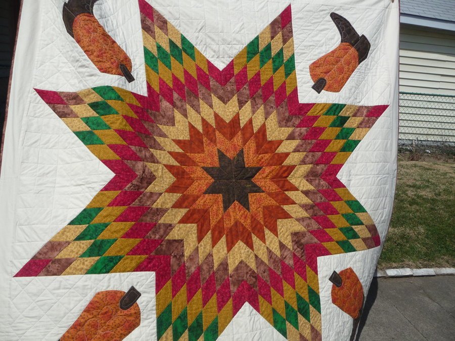 sssewr Xavier's Lone Star - I started this quilt in a weeklong workshop and completed the entire middle section and brown border seven years ago. I didn't know how I wanted to quilt it, so I hung it in the closet. When I decided how I wanted to quilt it, I did most of the quilting, but didn't know how to embellish the large setting squares, so it went back to the closet. When Xavier moved from a crib to a bed, I knew it would be for him and decided to applique large cowboy boots in each corner. After a trip to Houston for the show in 2012 and being unable to find a suitable stencil, I just traced my own boot, and put a stitching design on it. He finally got it for his 4th birthday in March. He loves it and sleeps under it every night.
