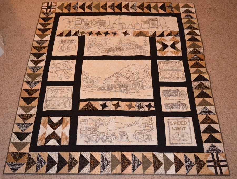 frans21 Rusty Road Relics - This pattern was one that I fell in live with! I live doing embroidery but added by own unique elements. I used variegated threads in dove to tan shades. I added my own unique elements and stitches to include some dark copper metallic to give a rusted element to certain areas. I also added my husband and my initials carved in a tree and other messages. With the piecework I followed the pattern but turned some of the blocks. It was fun to work on!