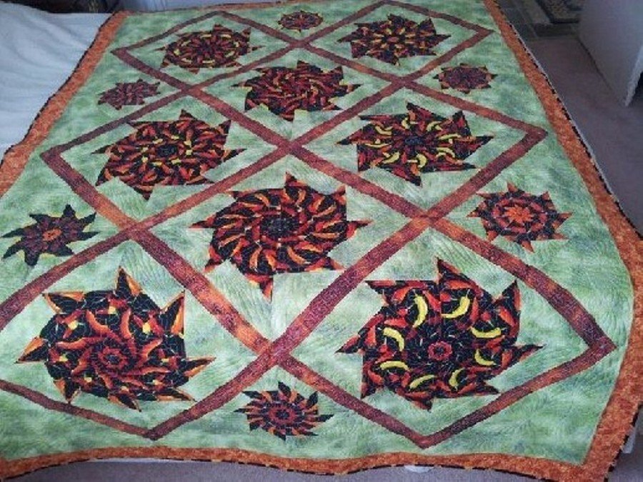 | Design Source - Description | This Stack-n-whack pattern lent itself well to the pepper patterns on the fabric. Made for my husband (a real chili head) as a comfort size/large lap-quilt. |