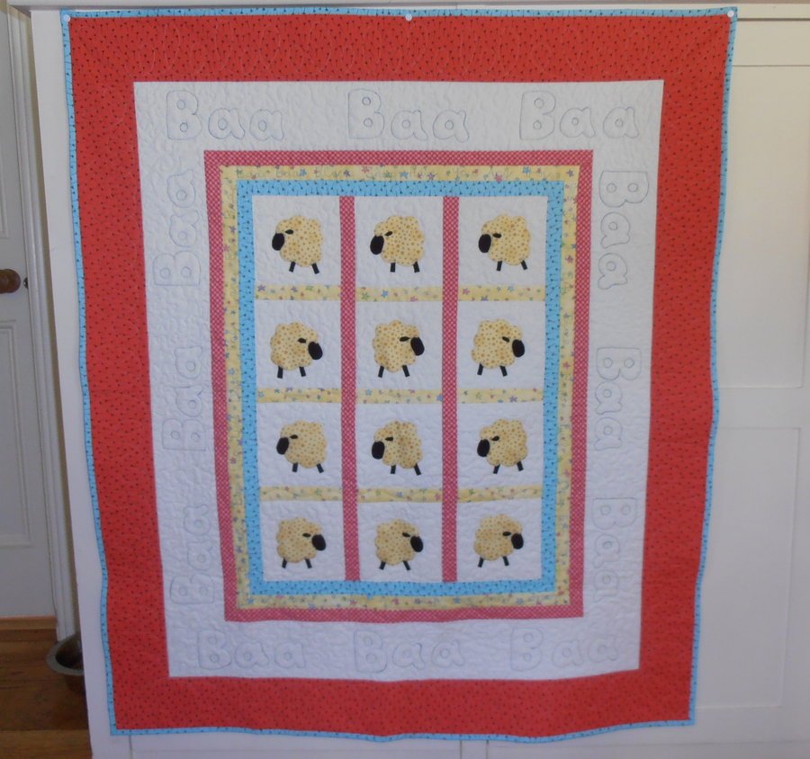 Reetzbobeetz Baa Baa Black Sheep - I made this quilt for a friend's niece. Love making sheep. I stitched the nursery rhyme all around the sashing.