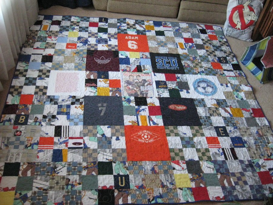debbiethompson For the Love of Adam - Created from recycled clothes worn by their son, Adam, who died as a teenager, the Fulk family commissioned 2 matching queen sized quilts as memorial gifts. Fabric from blue jeans, boxers, baby clothes, a neck tie, a set of sheets, T-shirts, a hockey uniform, shirts, hats, coats were divided evenly between both quilts.