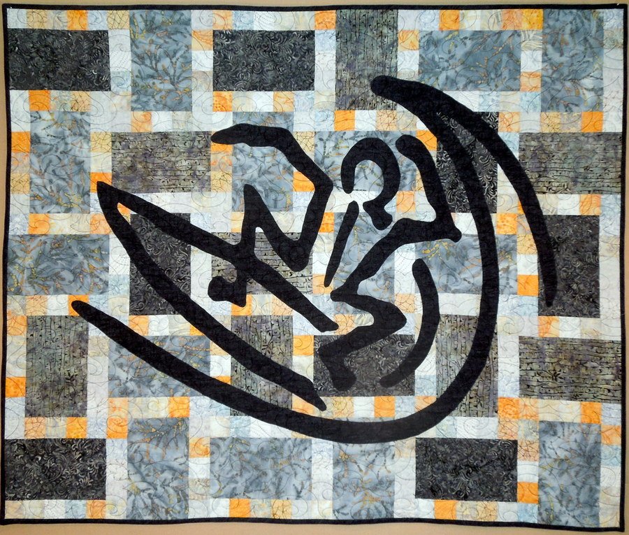 BurleysGirl Dawn Patrol - Made for my surfer son, I used Tricia Lynn Maloney's "Steppingstones" pattern for the background and received AlohaStickers.com permission to use their Surfer Petroglyph graphic for the applique.