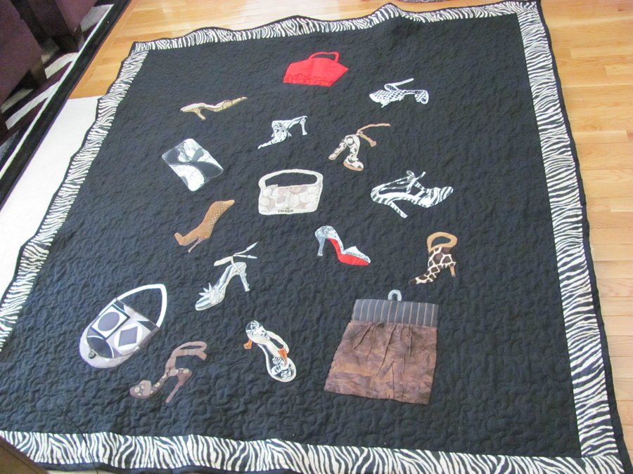 Breezy5 Fashion Finesse - Enjoyed making this quilt for my daughter. She is a fashion "Diva". It is totally made from Kona cotton and 80/20 batting. The back is a swirly design that worked well with the shoes and purses. The inspiration for the shoe and purse designs were from Coach, Christian Louboutin, and Manolo Blahnik. This one was a lot of fun!