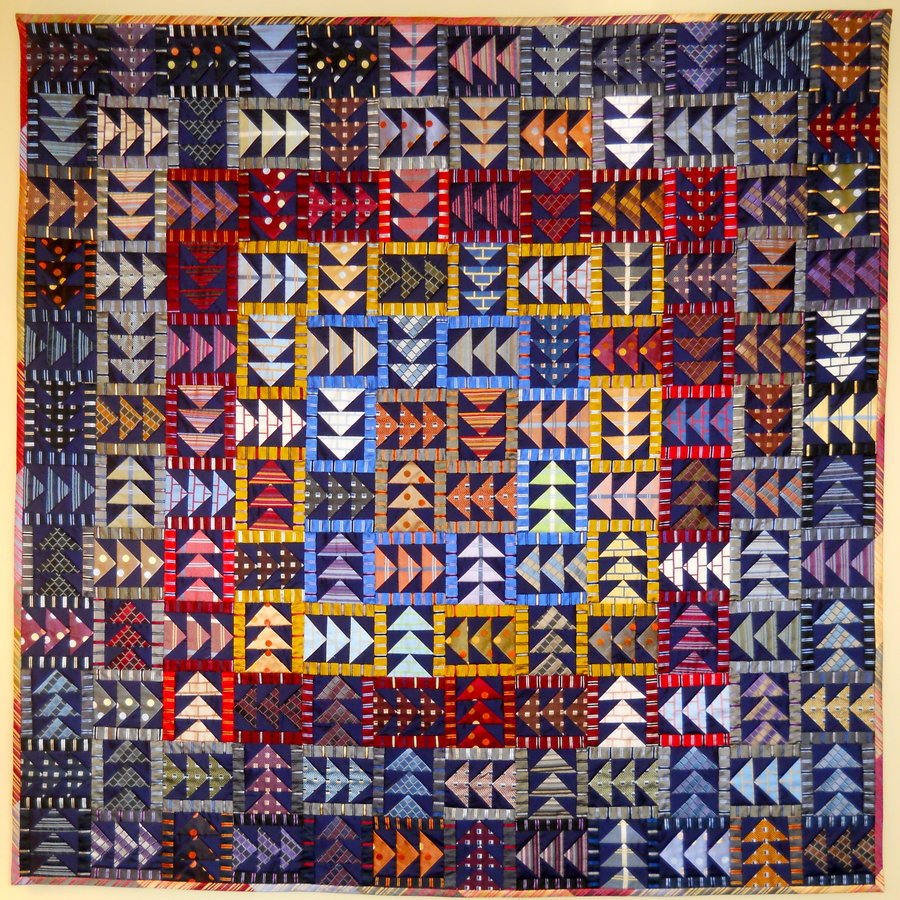 BetsyV Midnight Flight - 3-D flying geese made from silk tie sample fabric. Based on Hoopla Design's pattern "Pieced Silk Tie" in the Shelburne Museum