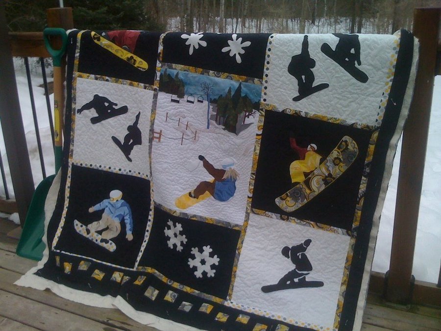 Appliqué snowboarders at our local ski hill To seemore of my work you can go to www.morelcabincreations.com |