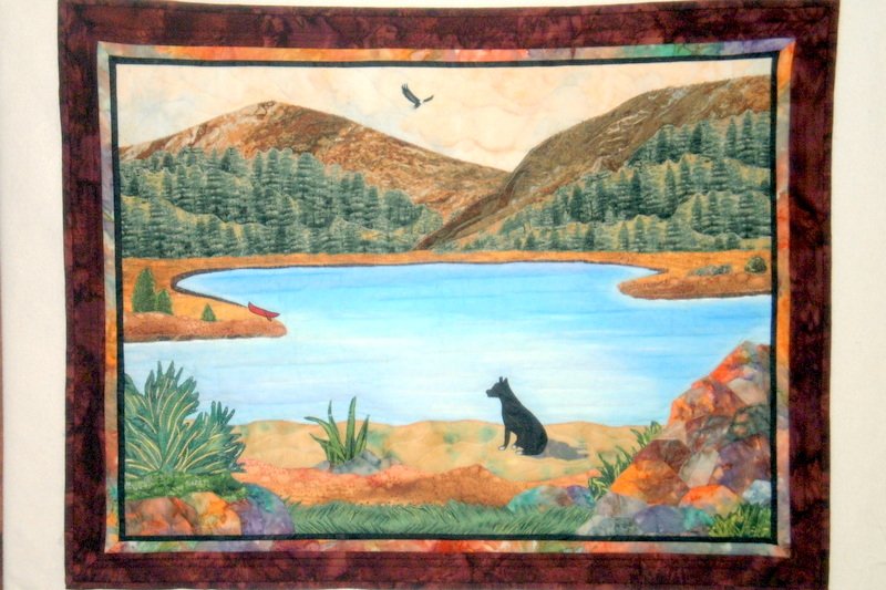 quilter1955 In the Land of Oz - It is a landscape quilt with my dog Ozzy over looking a lake... It was inspired one day when I took him down to our lake close to our home and he was having a good time near the water..It was a peaceful ,beautiful day in which I tried to capture in the quilt..