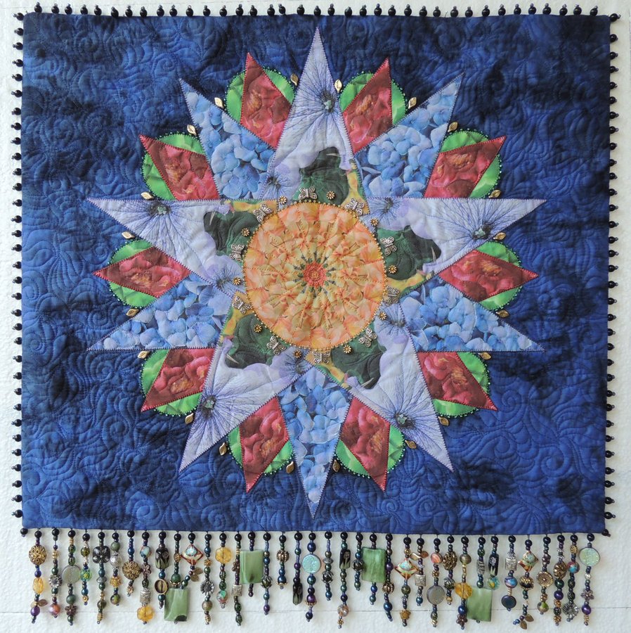 | Design Source - Description | Designed and entered in Quilt Alliance "20" Contest. Fused Star with fabric of my flower photographs. Bead Embellished, Beaded fringe at bottom. Will go to auction December 2013. |