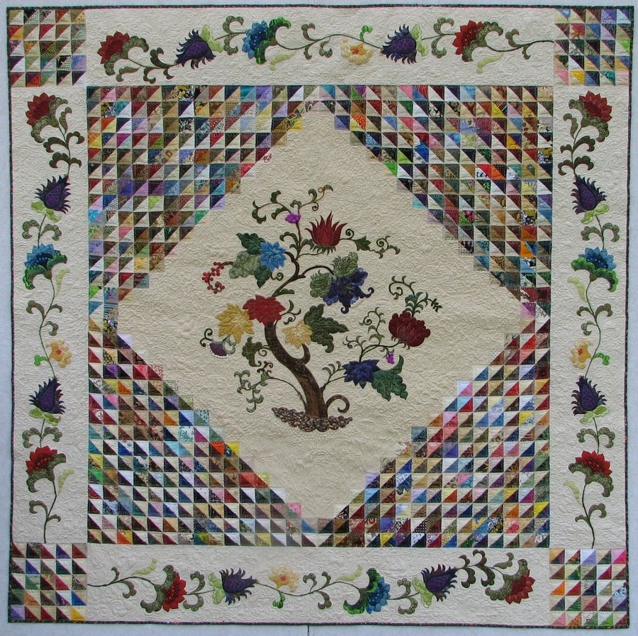 CowtownQuilts Tree of Life - Tree of Life was created using HSTs from the SOTTTs exchange. It all started with Edyta Sitar's first show on TQS. 160 quilters from around the world participated in this exchange. The quilt's roots are from the exchange, where a quilt (tree) grew. I quilted little fairies and magical creatures into the quilt to show how we all participated in the growth of this tree quilt. There are about 700 HSTs on it.