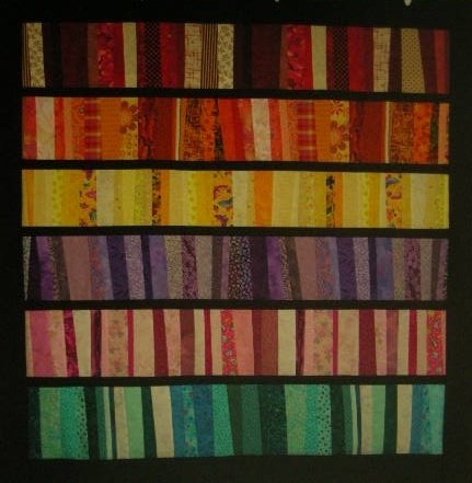 northwind String Theory I - When I saw Heart Strings in The Quilt Life, I dropped everything and dug out my strips. I started with apprx 13-inch strips, then cut the sewn strips in half lengthwise and sewed them together for a longer strip. This quilt made a good canvas for practicing all-over free motion feathers. I still have several pieced strips in more subdued colors for another quilt. I liked Jennifer's idea of quilting first, then adding applique, which I will do on the next string quilt.