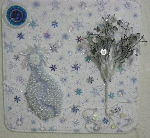 northwind Frozen - This was a word challenge quilt with my art quilt group, the Van Go-Go Girls. Choose a secret word, 12x12 quilt. The doll is the Snow Queen and I totally encrusted her with beads--she has a pale blue heart. The blue moon is a large crystal button from my MIL's button box she had given me, with seed bead halo. Satin stitch edge. See my blog for details. My word was "Frozen." First in a series--Jack and the Beanstalk is next.