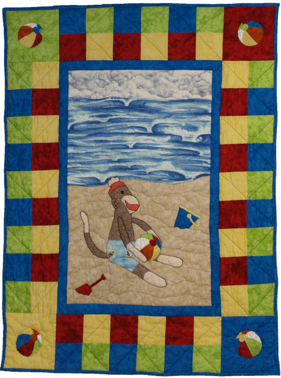 kelhuns Danik's Sock Monkey at the Beach - This quilt was designed and made for my first grandson, Danik. My daughter, Megan, loves Sock Monkeys so what better way to welcome my grandson and her son into the world than with a Sock Monkey quilt!