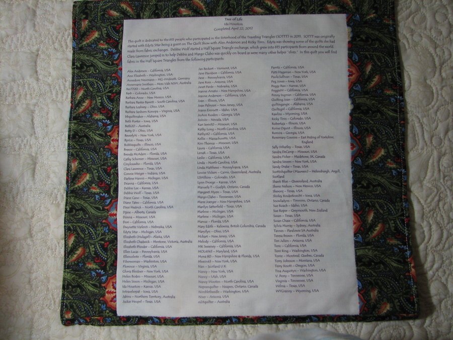 CowtownQuilts Tree of life label - This is part of the label of the quilt, Tree of Life, where I listed all the names that I found on the HSTs that were marked in the SOTTTs exchange.
