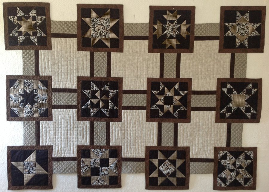 Threadmizer Choc a Latte' - Our guild had a star BOM 2012. I wanted to do something different with my block so I adapted the 12" blocks to the Stepping Stones pattern that I had saved from the American Patchwork magazine.