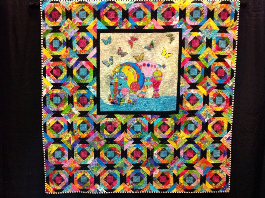 DebbieWolf Gentle Joy - This was made as a Christmas gift for my granddaughter. She wanted a purple hippo, but once we started looking at fabric she wanted all of it. Isn't that just like a quilter! The center medallion was inspired by a watercolor drawing by Jo Lynch, whose work is incredibly delightful. This particular drawing was a perfect way to incorporate all the joyful fabrics that Amber chose. I added the appliqué butterflies for the final touch of whimsy.