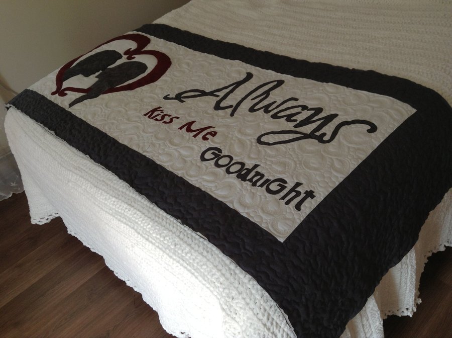 Morelcabincreations Always Kiss Me Goodnight Bedrunner - Unique and Romantic showpiece to add to your bedroom. Add a little romance and set the mood. There is a pattern available for this at http://www.craftsy.com/user/982803/pattern-store
