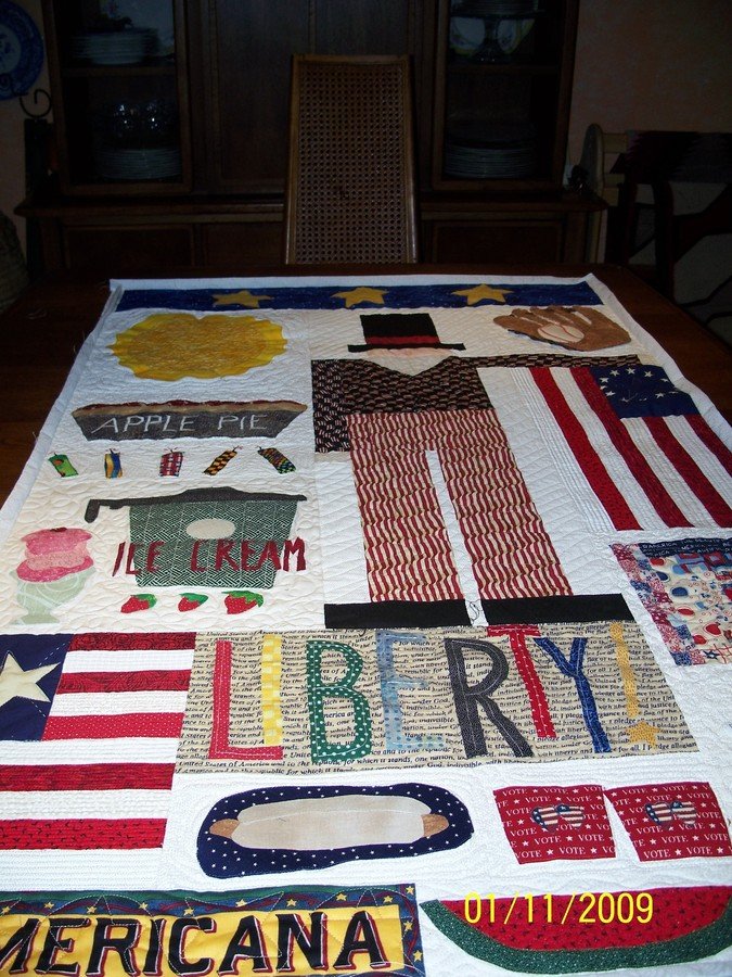 1Rodeoquilter Celebrate Americana - Changed out a purchased pattern, added baseball glove and quilt block, Reminds me of Summertime. Can't recall the pattern name as I worked on it different years.