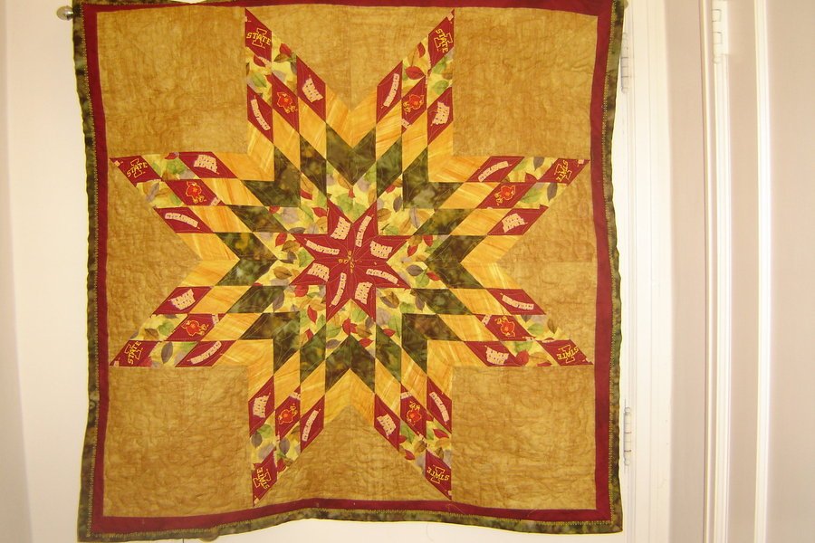 KarenGood Cyclones Lone Star - This is a lone star wall hanging made with Iowa State University Cyclones fabric. I fussy cutted the Cyclones, Cy, Iowa State, and I State from the fabric to insert in the design. The pattern came with interfacing design that was used to iron on and sew the 2 1/2"x5 1/2" strips of fabric on the interfacing pattern. I did all the sewing and stippling myself. It was bought at the Cardinal and Gold Gala so am not certain who purchased the wall hanging. Also put a hanging sleeve on the back.