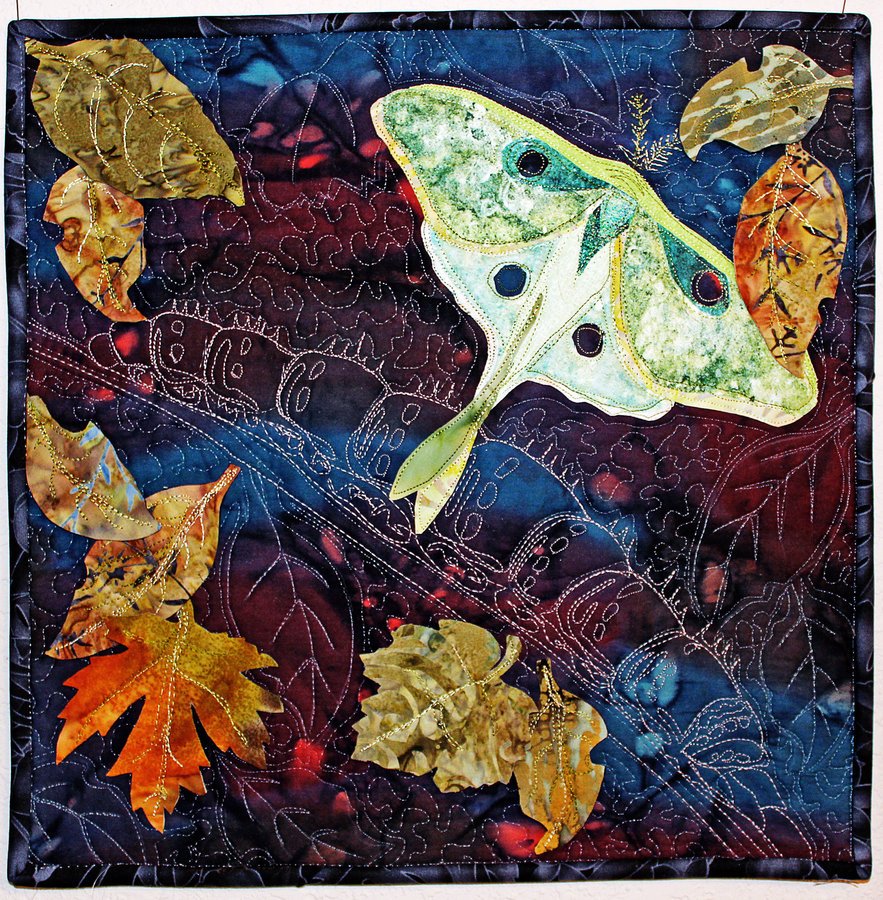 mopheads Luna Moth - This Luna Moth and thread painted caterpiller are part of an original design using a square format. The leaves are 3-D and have a front and back, attached where the veins are on the leaves. To read more on this go to http://windyglenquilting.blogspot.com where I go into more detail.