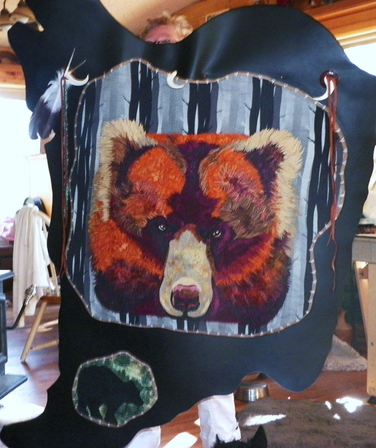 chriscl4649 Bear - Bear is mounted on cow hide Leather, embellished with bear teeth and beads. The outer part of the leather is cross stitched with sinue and feathers found from birds around my home (already sheaded from the birds on the ground)
