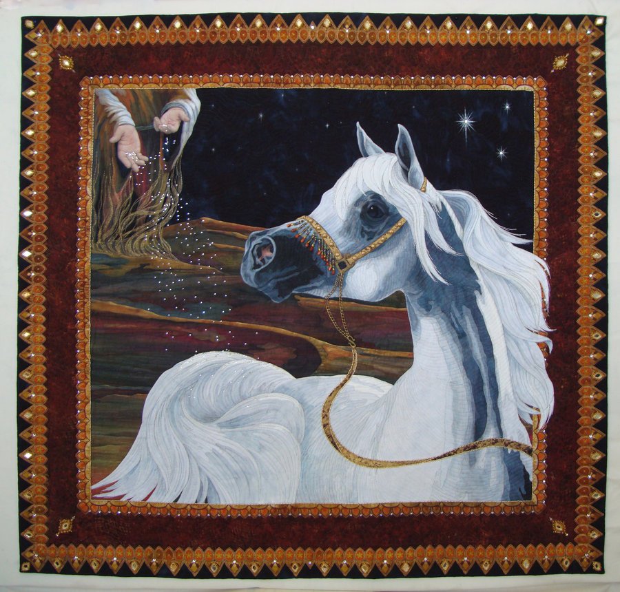 mtnhorse Chosen - I have had a lifelong love of horses, and the Arabian breed I find to be the most compelling of all in their beauty and heart. A Bedouin myth states that this horse was created out of a sandstorm as a gift from Allah to those nomadic people. Over 175 pieces of fused, raw edge appliqué, fabric inks, paints, colored pencils, and 50+ hours of hand beadwork, crystals and shisha mirrors helped bring this event to life.