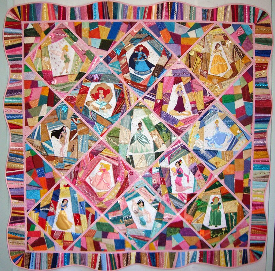 thebooklady27 Little Miss Ava's Princess Quilt - Disney Princess applique patterns adapted from coloring pages found online. Crazy quilt done entirely by machine. Many fancy machine stitches, with additions of beads, baubles, ribbons, yarns, fibers, charms , hot-fix crystals etc. Some fancy stitching came from ideas by Carol Ann Waugh in her book Stupendous Stitching.