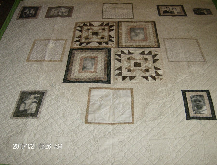 WandaQuilts This is Your Life, Lois - Lois' photos in the center; early years upper left; her wedding & sons in the upper right; her grandchildren lower left & great grandchild along with quilted frames to add more as they come along, lower right. There are photos & a few blocks from an heirloom quilting class I took which include lace insertion, a vintage hankie & some antique laces from Lois's Mom's sewing room! A special gift for the Best Mother In Law!