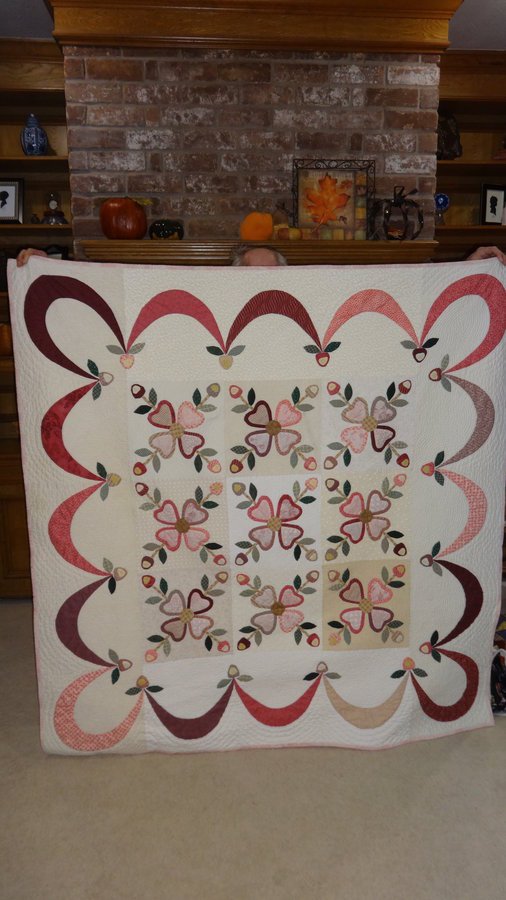 | Design Source - Description | Twelve appliqued rose blocks using different colors of rose and green for each block. |