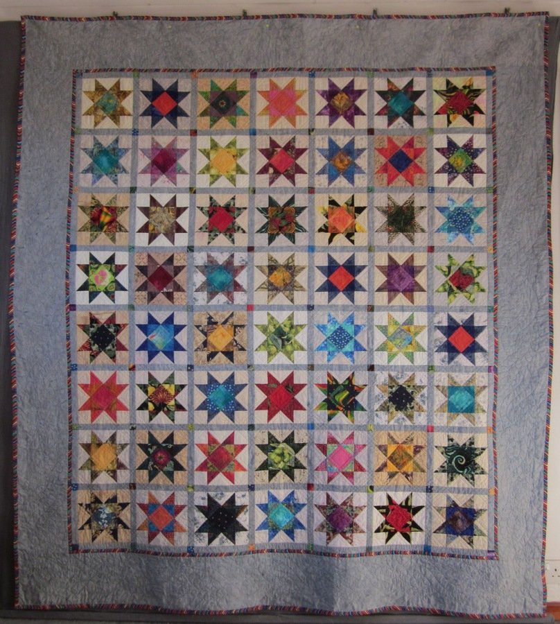 | Design Source - Description | This was my second stash busting quilt this year. I kept re-setting it on my design wall until it looked just right. Machine quilted on my Bernina with diagonal lines across the stars and a running feather and cable border. |