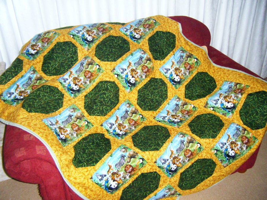 downundergirl Savannah - I made this quilt for my nephew Jack. It is a commercial jungle print . The green represents the wet season and the yellow, the desserts of Africa.