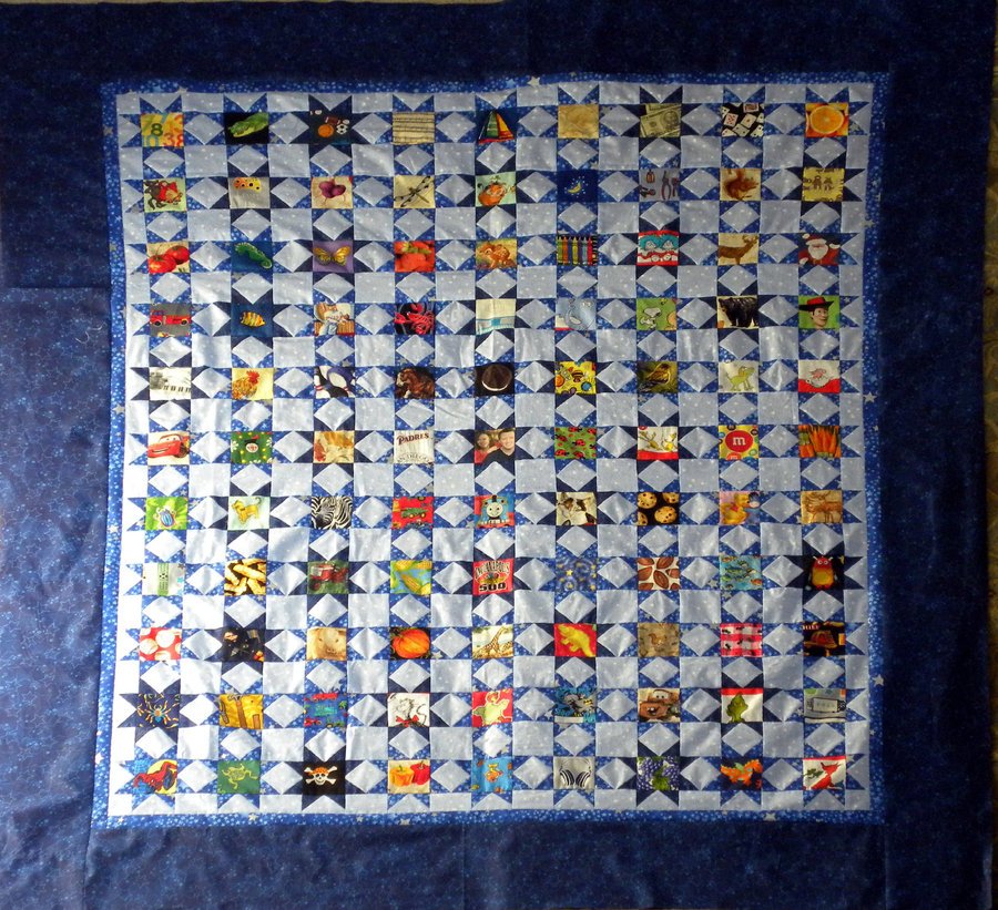 LauraLou Gibson's I Spy - This I-SPy quilt has 99 different fabrics as the center of each star. The center star is a photo block of Gibson's Mom and Dad. I made this quilt for my two-year-old grandson while working in Guam.