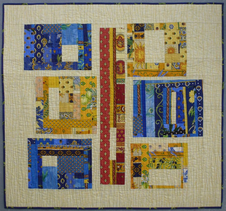 | Design Source - Description | This is an improvisationally pieced modern quilt. Most of the fabric is scraps from my stash of Provençal fabric plus a background fabric purchased specially for this quilt. It was made to hang in the cottage. |