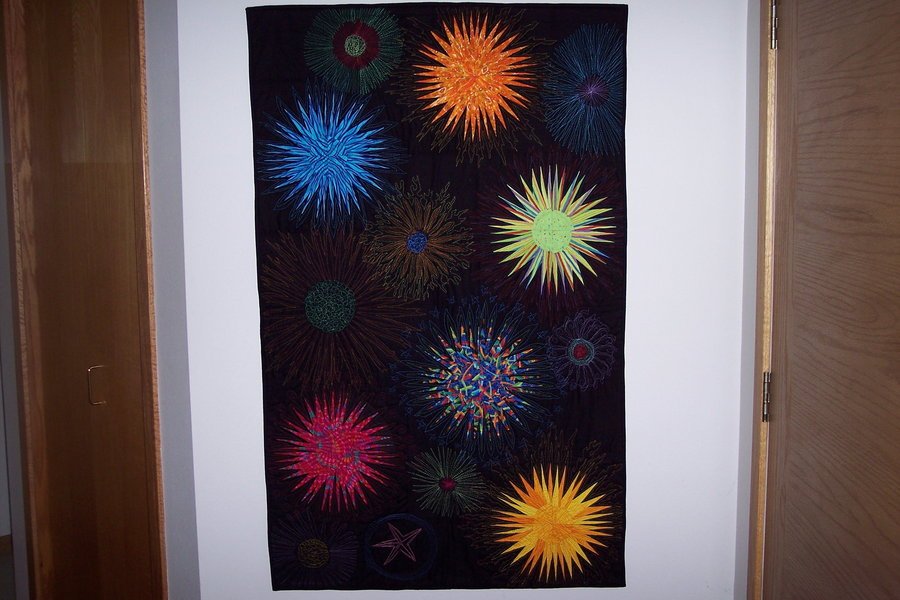 firequilter Finale - This quilt made from hand drawn New York Beauty style blocks is also heavily machine embroidered with rayon thread. It was made for the second Pyrotechnics Guild International Quilt Challenge Convention's Art Show.