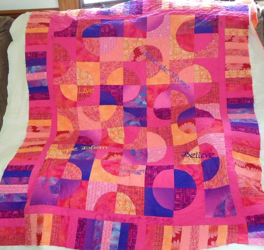 MarciaH Luna - I had this quilt on the design wall for over 6 months playing with the colors and learning more about contrast. The idea came from an advertisement for a quilt show. I was challenged also with the piecing of the circles. Embroidery was added when I decided it would make a great gift for my nieces graduation.