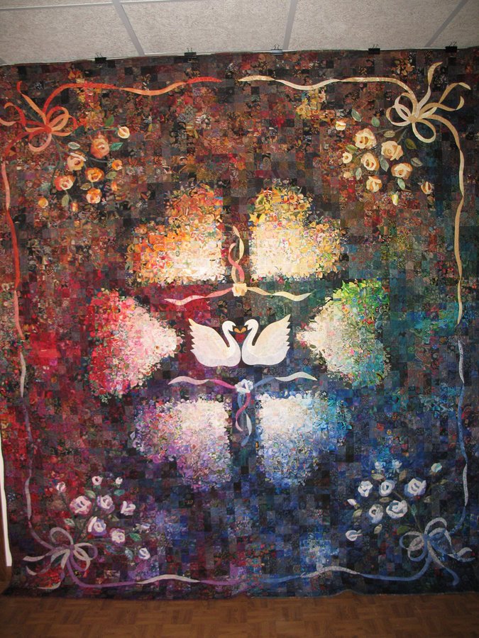 wcfav Reflections of Romance - Made for our 35th Anniversary....watercolor with needle turned applique of swans, roses and ribbons on top.