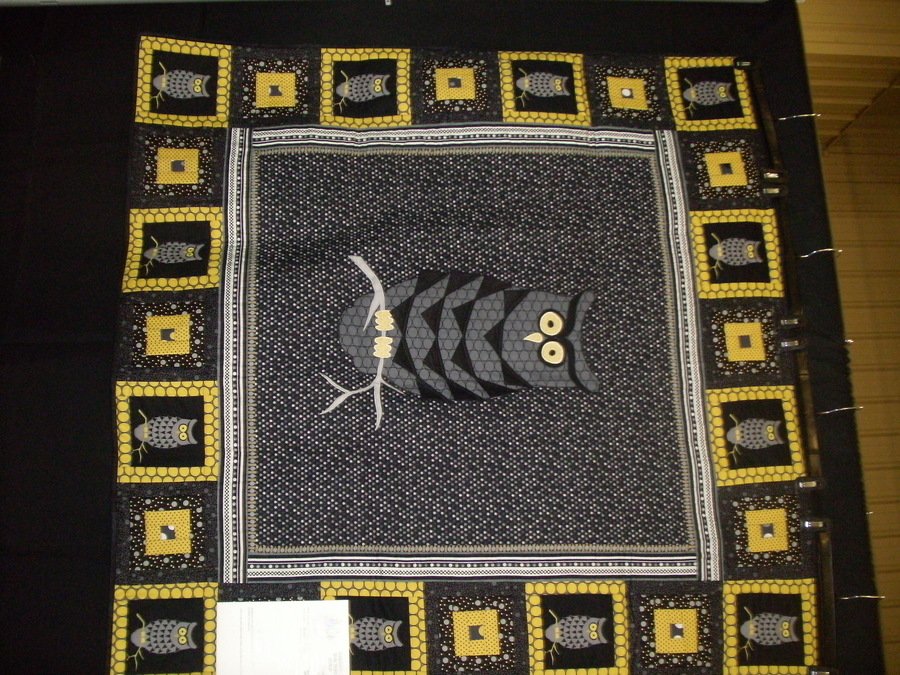 | Design Source - Description | Appliqued owl with continuous prairie point strips on body surrounded by log cabin & fussy cut owl squares. Pattern found in fabric store & fabric found at Mary Jo's in Gastonia, NC. |
