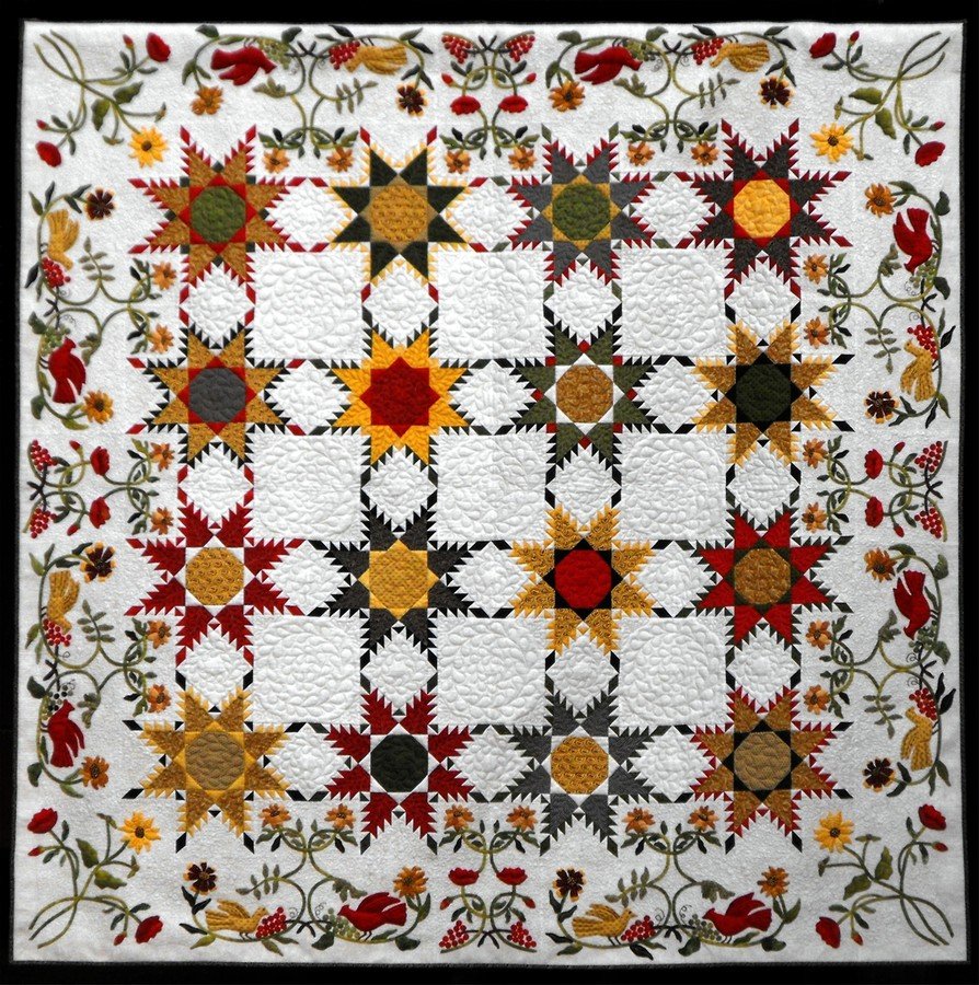 QuiltRode Celebration of Feathered Stars & Wildflowers - This raffle quilt is a collaboration of 22 members of the guild who love to paper piece, hand applique & embroider. Someone will be lucky to win this @ show in August 2014.