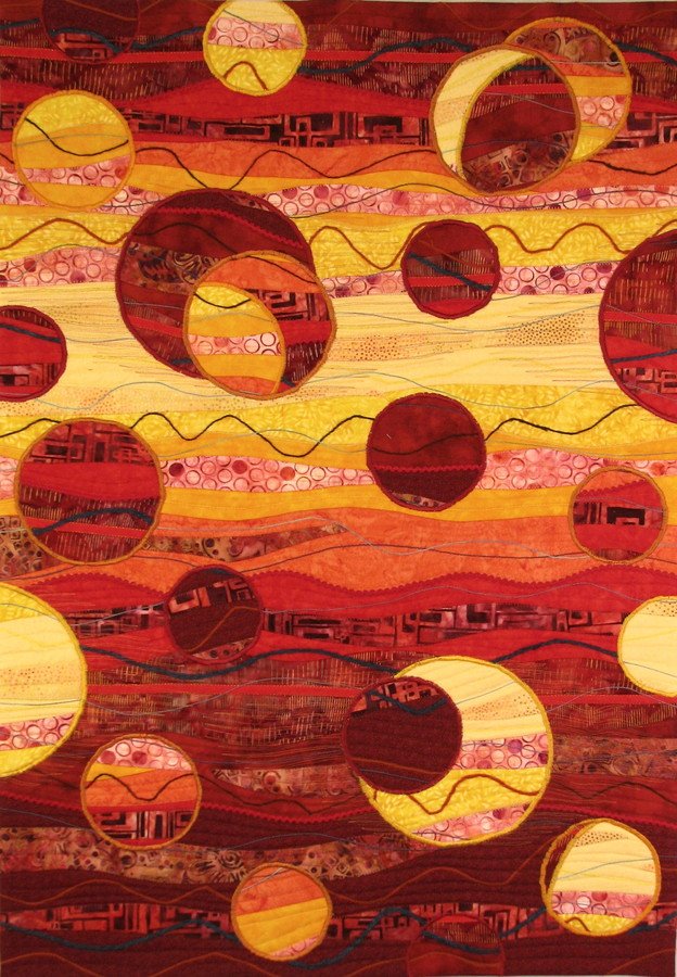| Design Source - Description | A strata of curved strips was assembled, more strips, trims and yarns added on top. Then circles were cut out of the quilt top and rearranged. Technique from Dena Crain. |