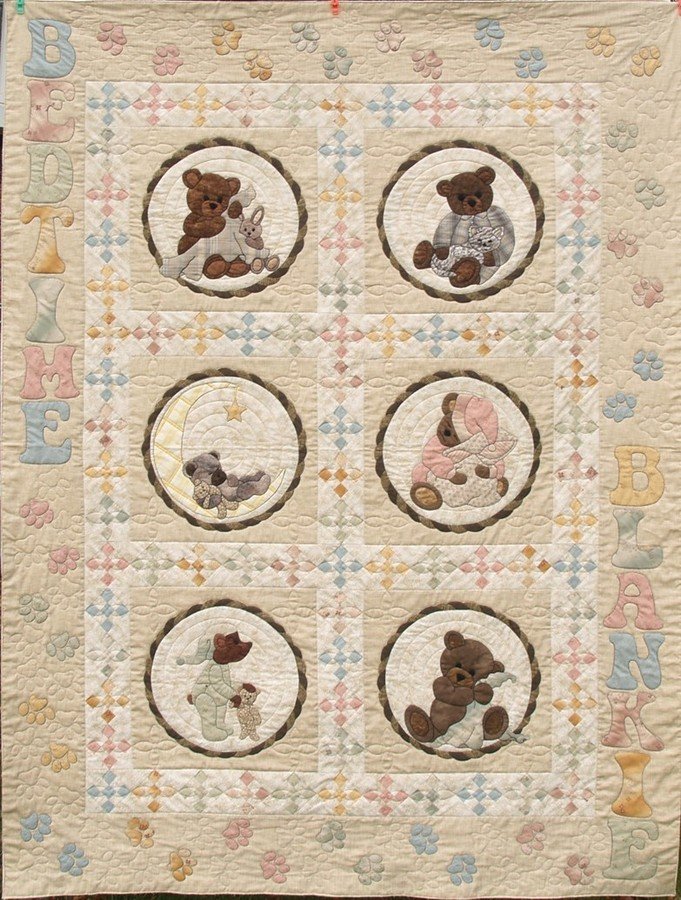 luv2appliqueca Bedtime Blankie - I started working on this quilt while I was caring for my elderly mother. The applique was portable and I could work on it while I was sitting with her in the hospital. The teddybears made her smile.