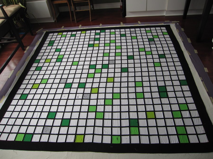 Paleger Frog in a blender - One day on my way home I saw a child walking home with a black and white checkered backpack with some minimum color added. For the rest of the way home I kept thinking of the back pack I had just seen. A few days later I put needle to fabric and made the Frog in the blender quilt.