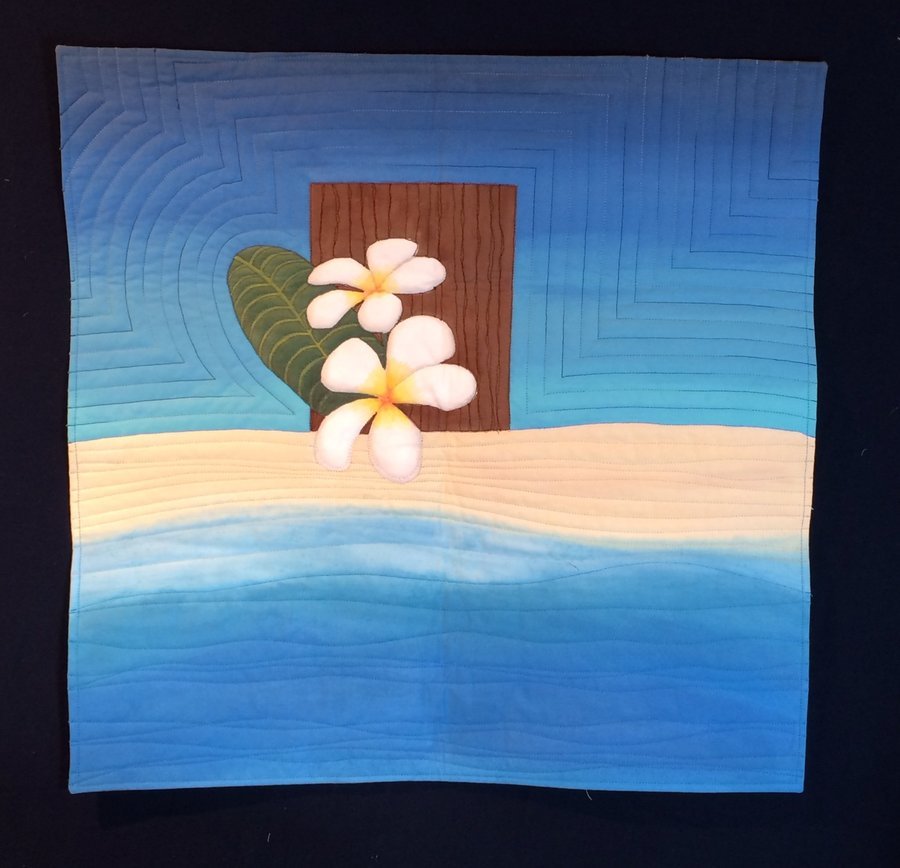 rutterla A Beach Runs Through It - For our 2013 Quilt Show, the Washington Stars Quilt Guild did a challenge called, "A River Runs Through It." The challenge required the quilts to be 21" square, with some form of "river" in the bottom third of the quilt. I included the beach and plumeria in the design because they hold special places in my heart. I hand painted the entire quilt top, as a single piece, then layered and quilted it.