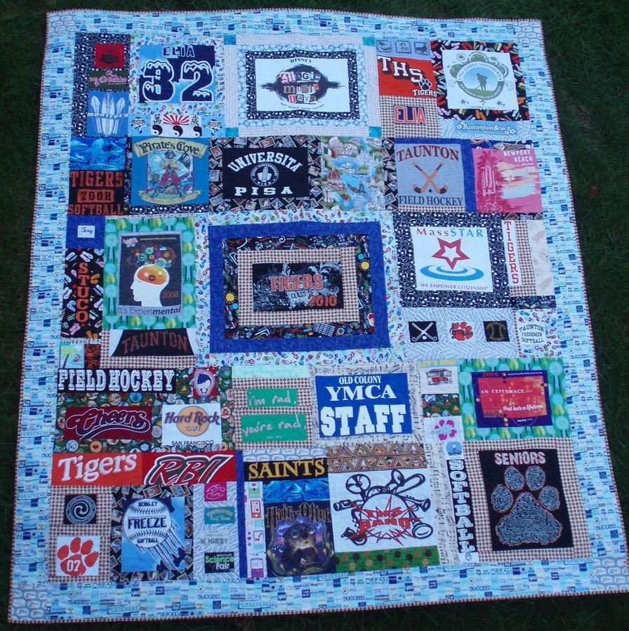 JanetE Victoria's T- Shirt Quilt - Using my daughter's T-shirt from her athletic, academic and music activities, each t-shirt square was stabilized and surrounded by fabrics that went along with all of her activities - it was like making a puzzle! Meander quilting design with hidden messages!