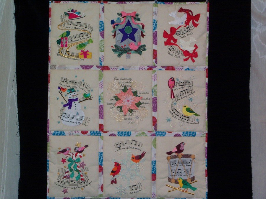 sweetr Christmas 1 - I love machine emb. Last year I purchased these bird designs with Christmas songs (birdhouses this year) and thought about "1" quilt-well to see them all I needed to make at least four. Thank you to EmroideryLibrary and all the wonderful designs.Lets not forget all the thread mfgrs. R/A Isacord, Superior, Maderia,Sulky.