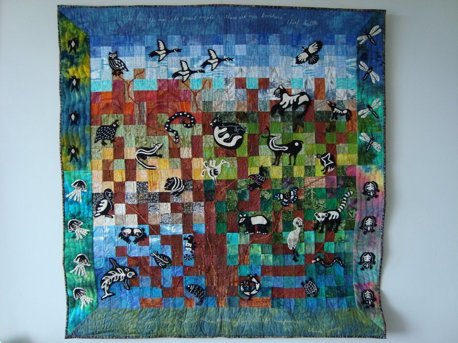 AtelierSpecht Tree of Life - many, many multicolored 2/2 inch blocks, sewn toigether to form areas of sea, swamp, forest, mountains, desert and sky. Tree stitched on in tread. Animals, black and white felt were inspired by Native American motives. Upper and lower border have embroidered texts from Darwin and Chief Seattle.