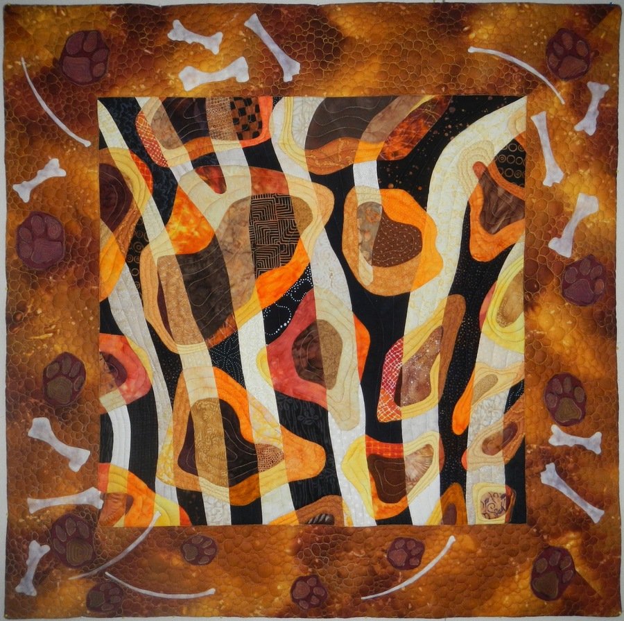 ckbellneville Lifedance - While on safari in Kenya, I was struck by the intricate and eternal dance of life and death between predator and prey. To depict that in this quit, I overlapped zebra stripes and giraffe spots in the middle and surrounded this prey with the tracks of the big cats: lion, leopard and cheetah. I then added the bones of their prey scattered about as we found them on the savannah. Hand-dyed cotton, cotton thread, wool and poly-cotton batting, Shiva paint stiks.