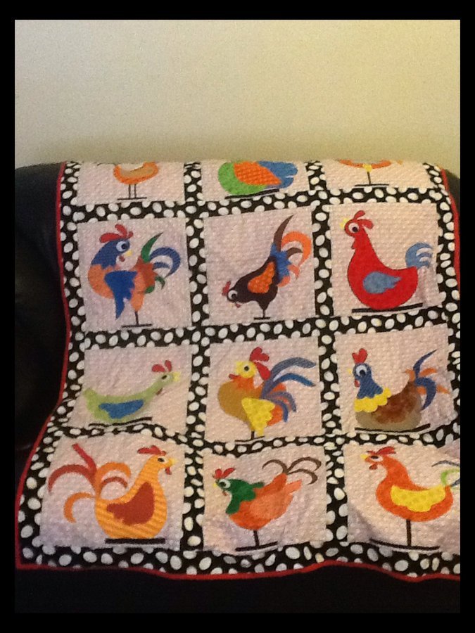 KimCJ Fiona's quilt - Colourful chickens on a Chicken wire print background