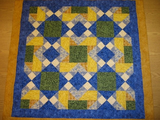 Welshwoman Sea and Sand - I wanted a completely new combination of blocks to showcase my friend's favorite colors. She loves the beach, so I called the pattern Sea and Sand. It was given to her as a Christmas gift. She has many walls in her bedroom suitable for small hanging pieces & the color and style match her decor.