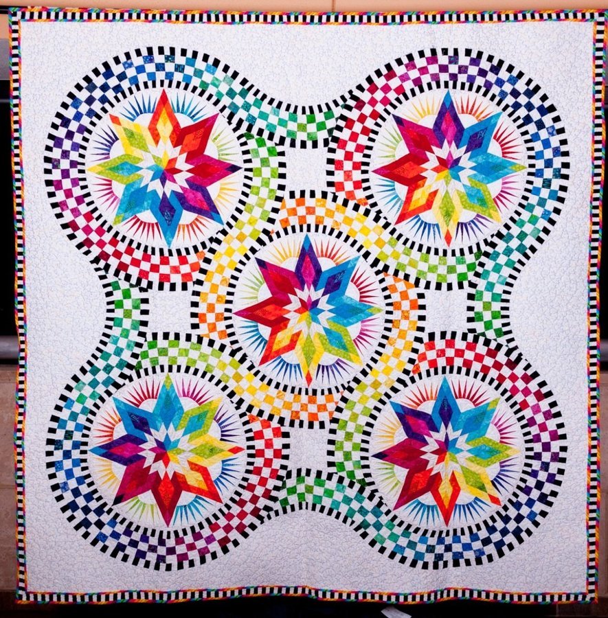 Incahoots1 Dancing in the Stars - The white fabric used in the middle of this quilt was pure white until I quilted the fabric with metallic thread before using it, in order to get sparkle into the quilt fabric. The white fabric around the edges is printed with holographic stars in order to add color. The circles are reminiscent of the whirring dervishes I saw in Turkey on a recent trip, hence the name, "Dancing in the Stars".