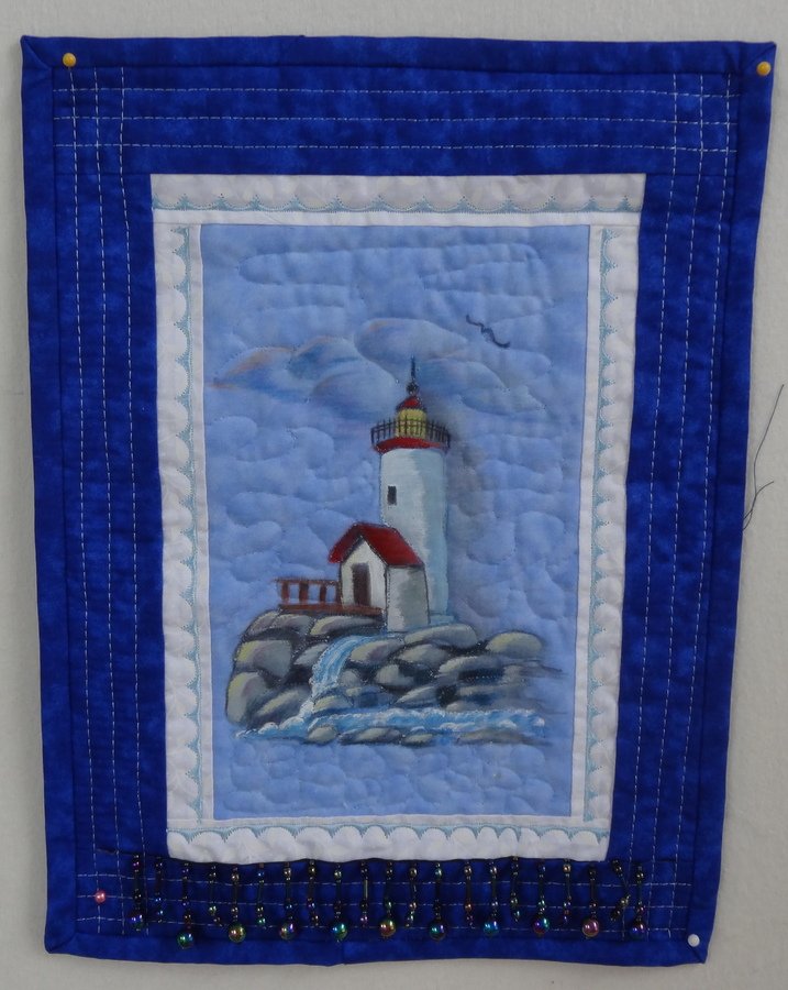 ackuchcik Lighthouse on the rocks - Part of the quilt is drawn with colored pencils and part with acrylic paints. I really like the way it turned out. I hung some hanging beads on the bottom to give it some glitz.