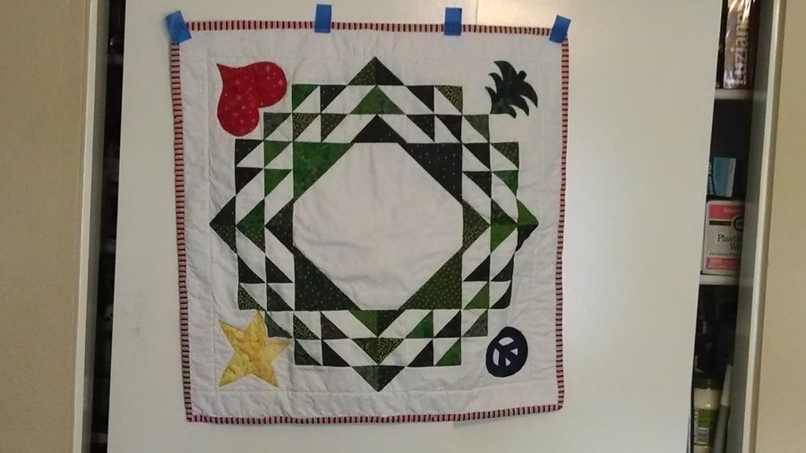 | Design Source - Description | 28" x 28" 100% cotton, including batting. Stitched in the ditch. Machine applique. |