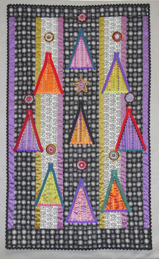 DBLTurtle Holiday Banner - I designed this quilt wall hanging for the American and Efird Push the Envelope Contest at the 2013 American Sewing Expo at Novi, Michigan. It won an honorable mention for outstanding threadwork, and is traveling with American and Efird Trade Shows for a year.